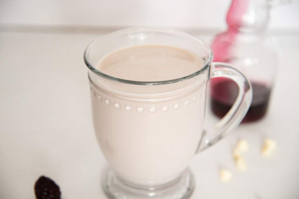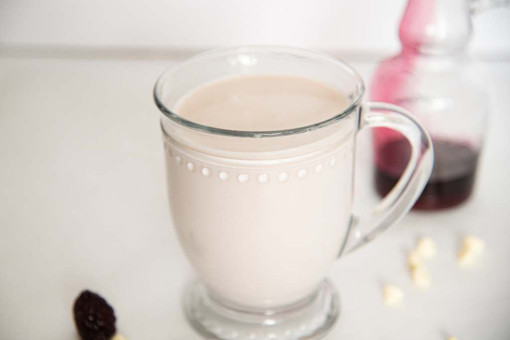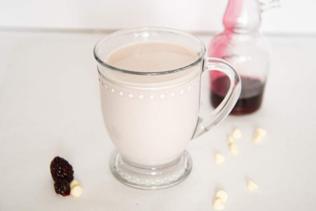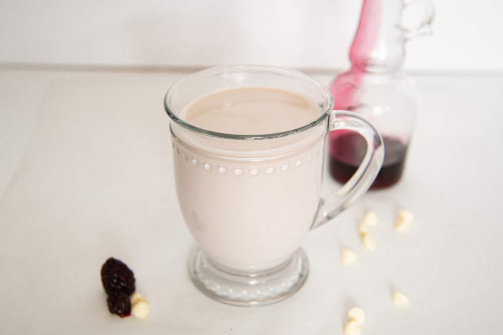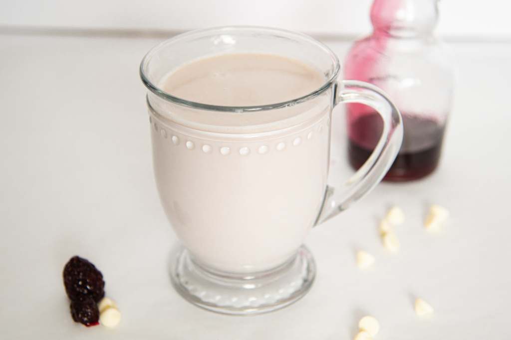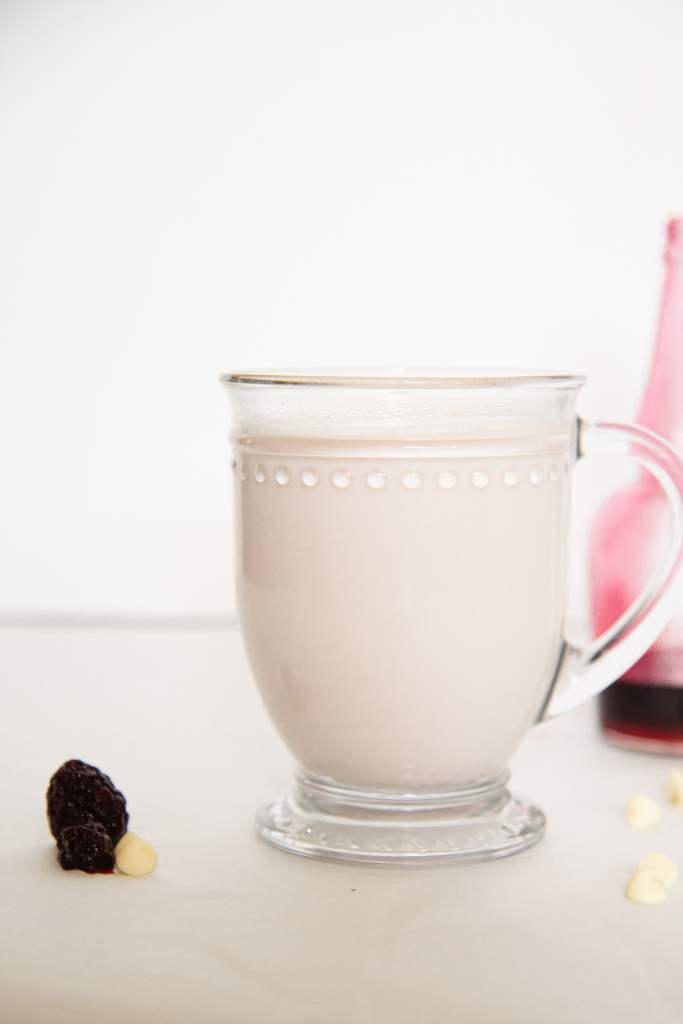 - Pour the blackberry syrup into a coffee mug, followed by the hot white chocolate milk.