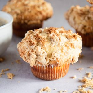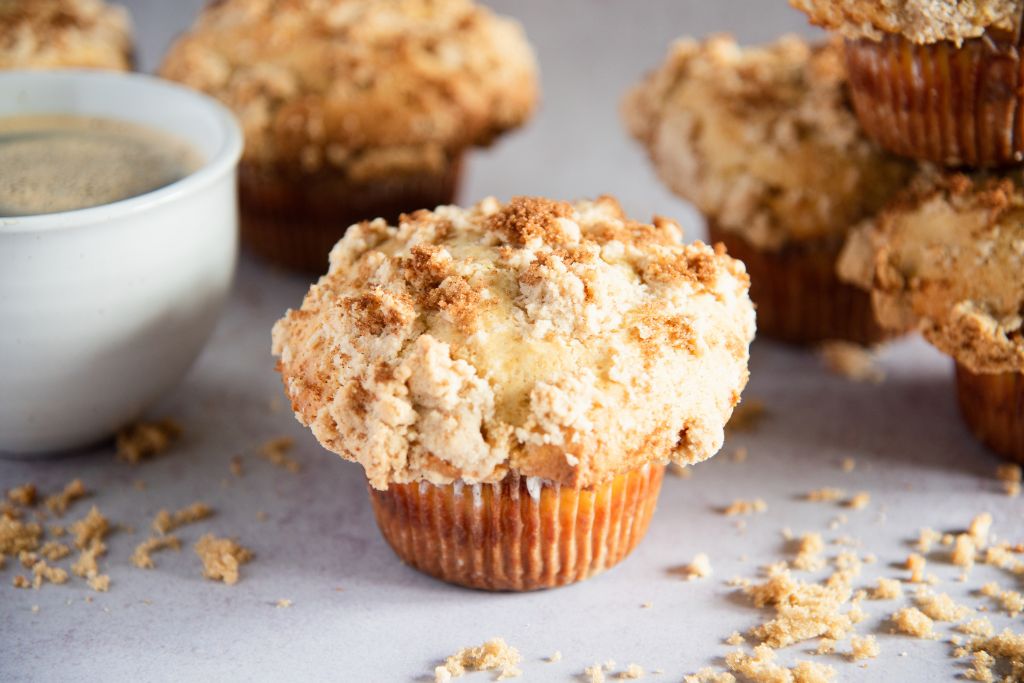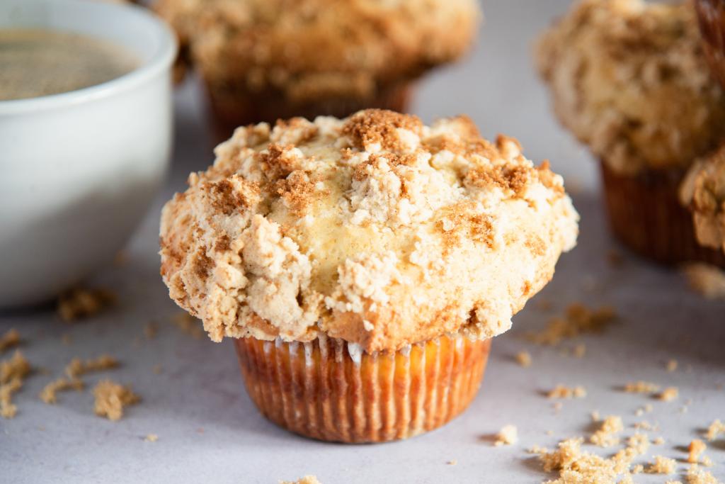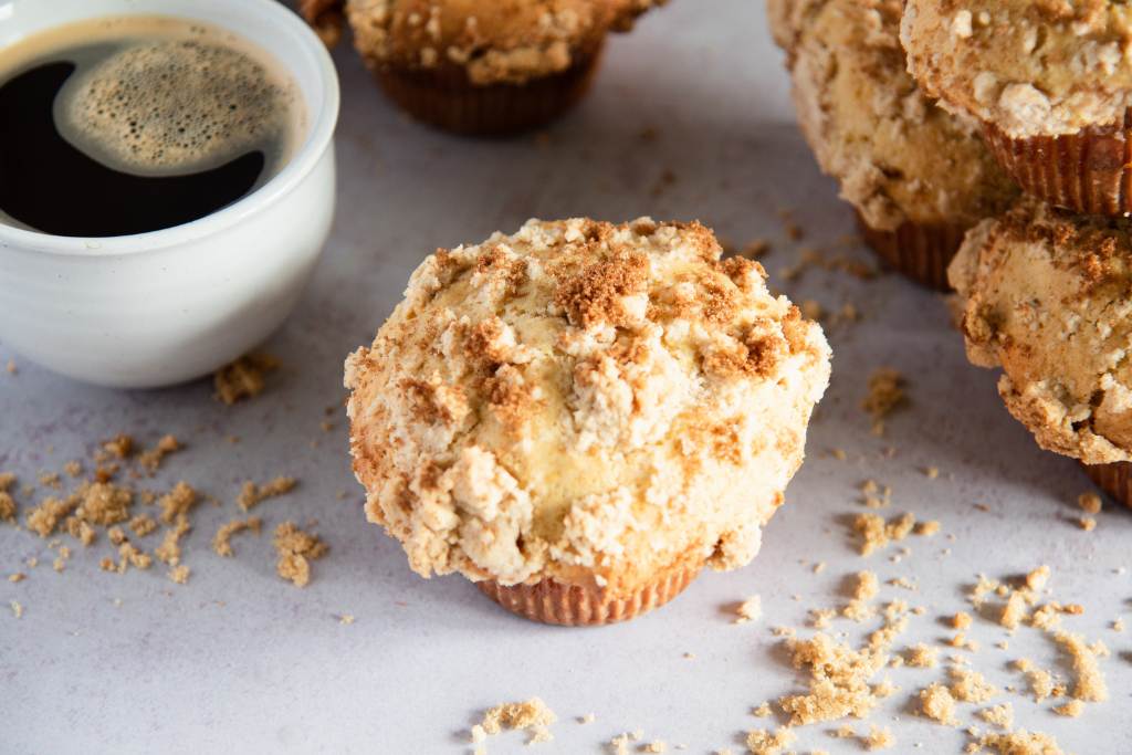 a coffee cake muffin, with a cup of a coffee and more muffins behind it