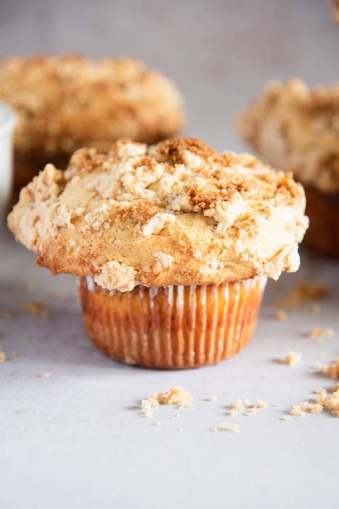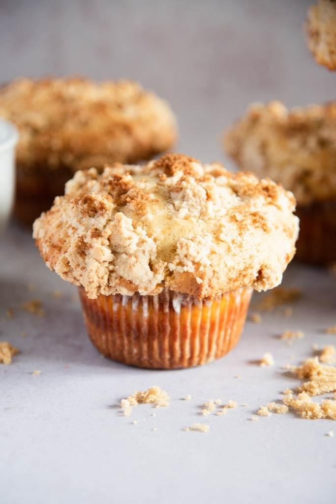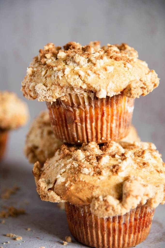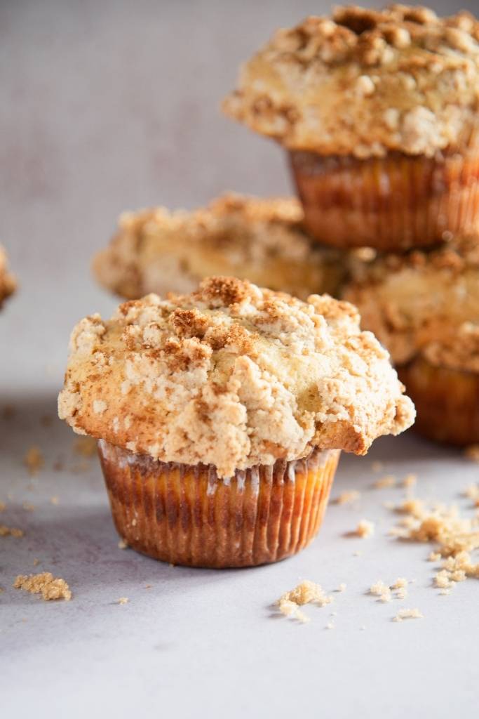 a coffee cake muffin, there is a few muffins stacked on top of each other behind it