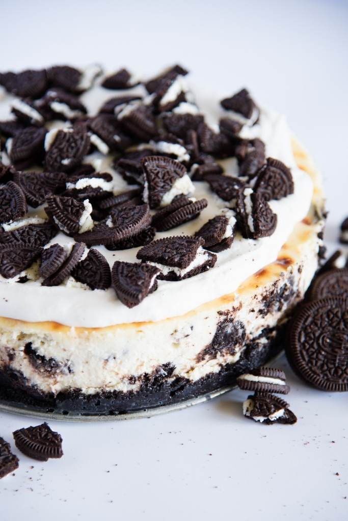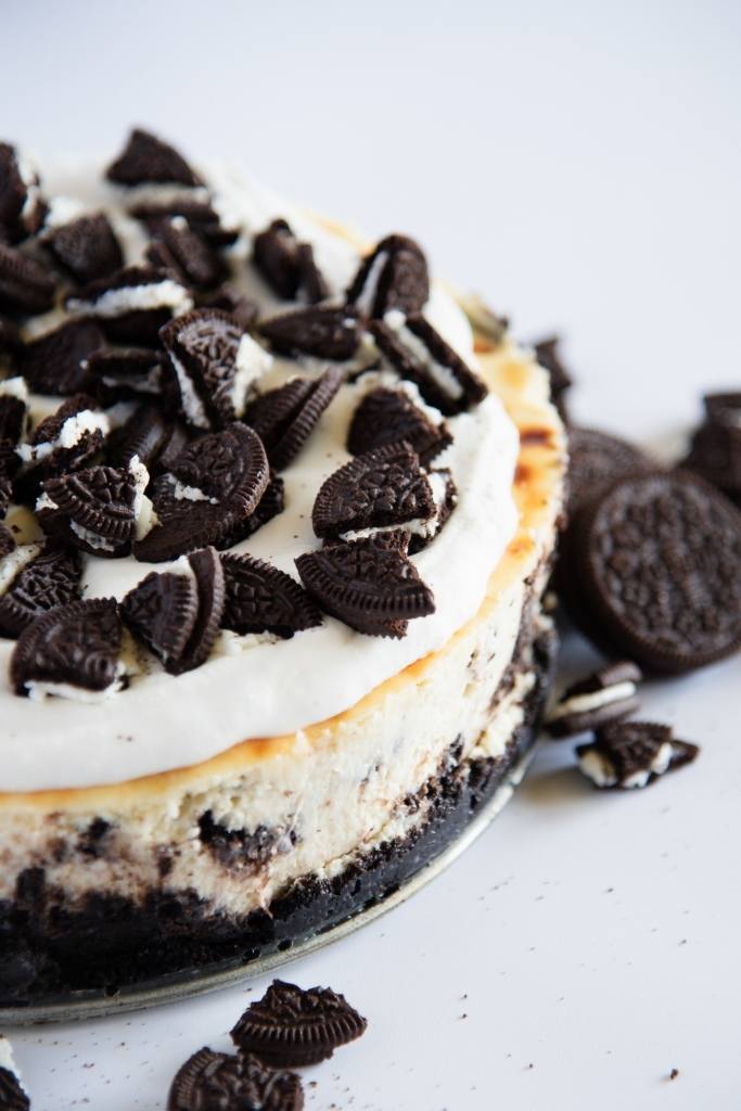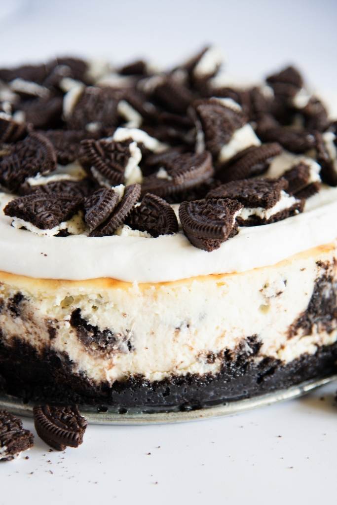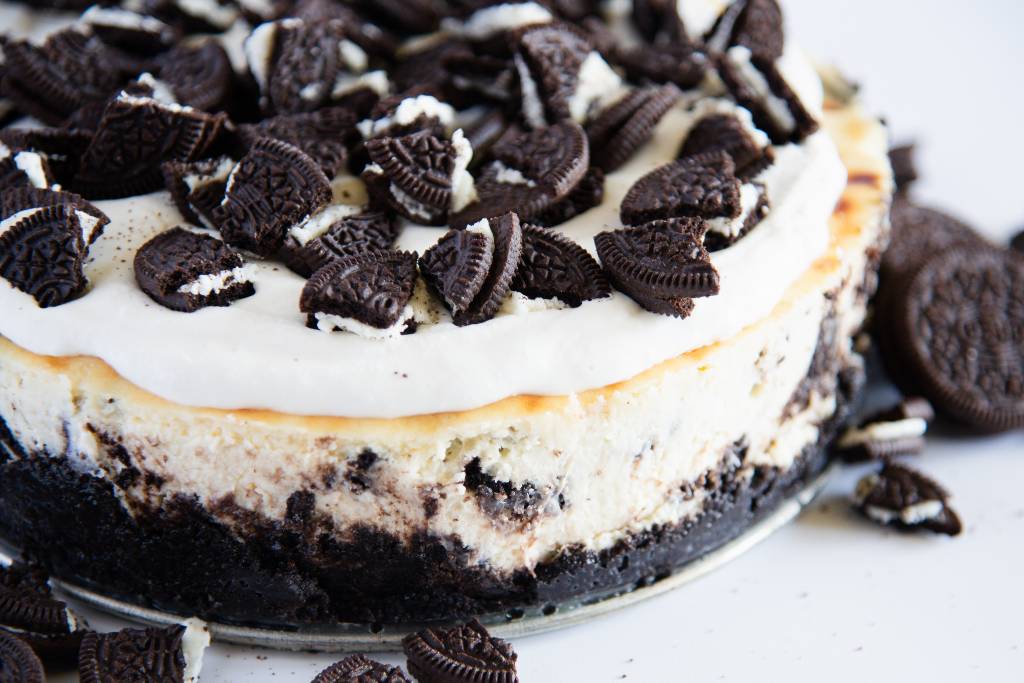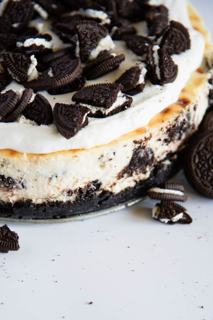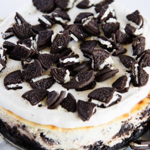 - Once the cheesecake has chilled, release the springform pan, and transfer the cheesecake to a plate(though you can also serve it from the bottom of the pan), top with whipped cream and Oreo cookies.