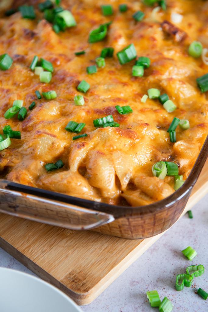 Transfer your mac and cheese to a 9 x 13 baking dish, top with shredded cheese and green onions(if using), and bake at 350 degrees F. for 15-20 minutes. Or until the sauce is hot and bubbly and the top is golden brown.