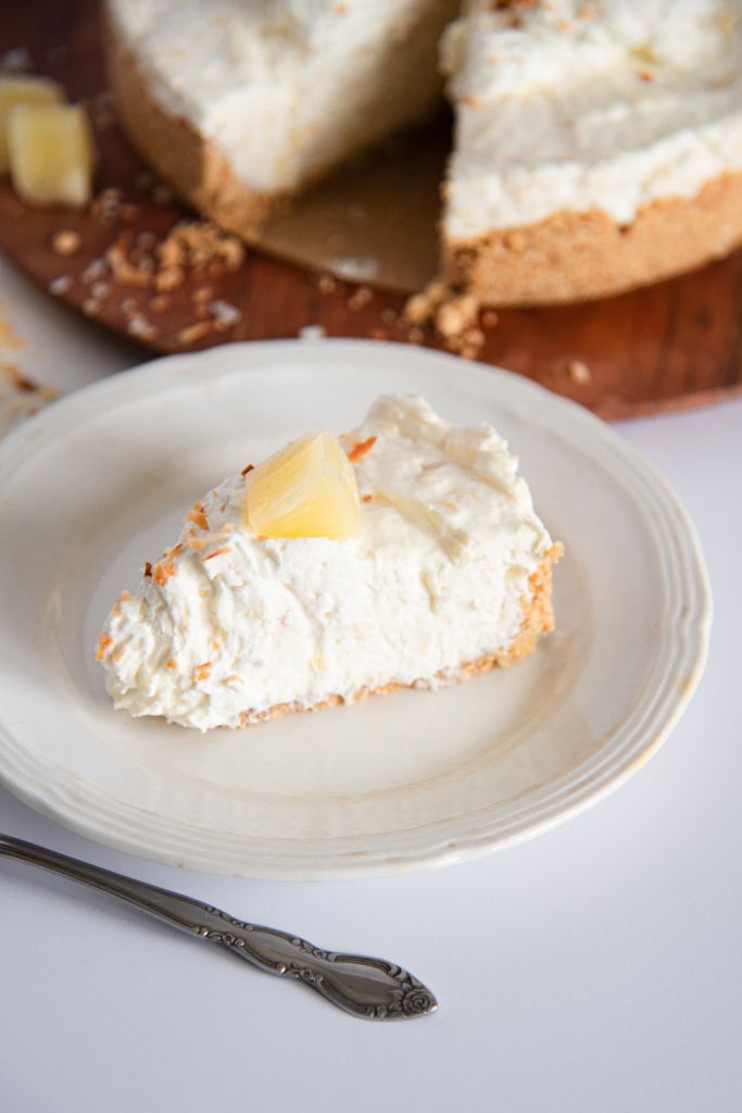 I love topping this cheesecake with toasted coconut and fresh pineapple, but it’s also great topped with any of the following: fresh strawberry slices, citrus fruits(like mandarin oranges), maraschino cherries, and chopped nuts!