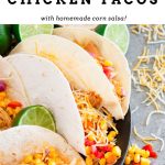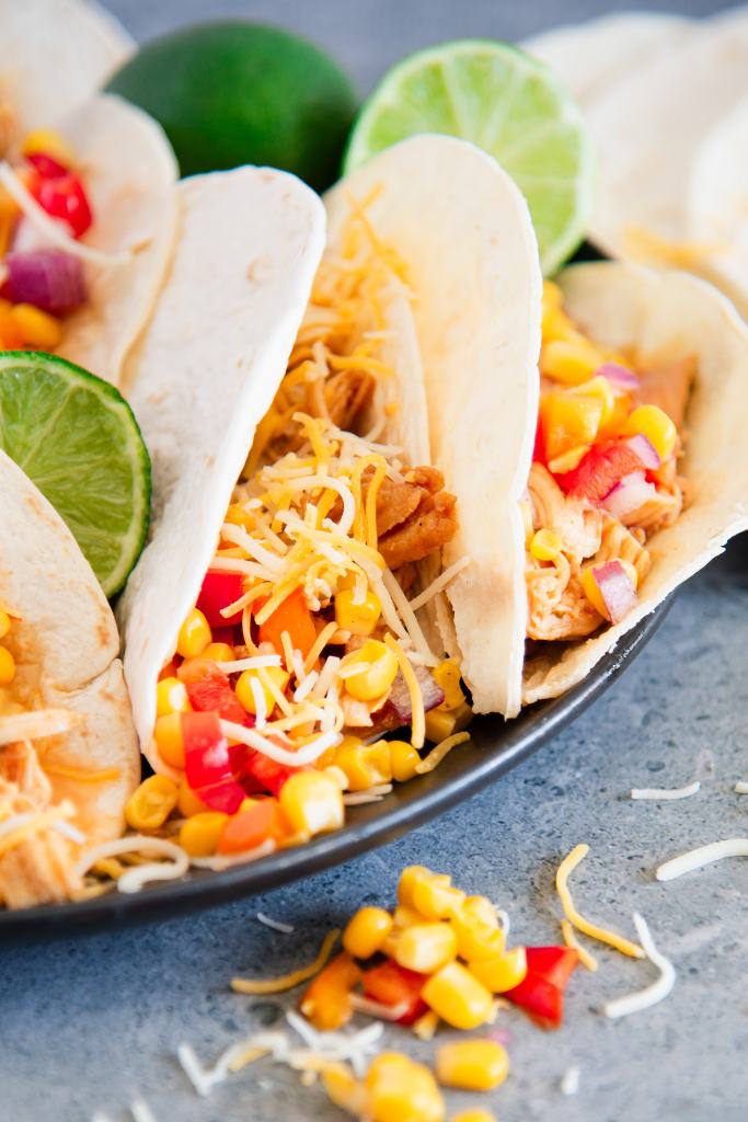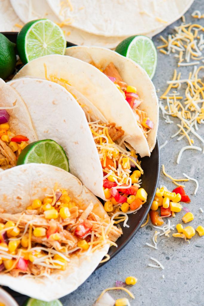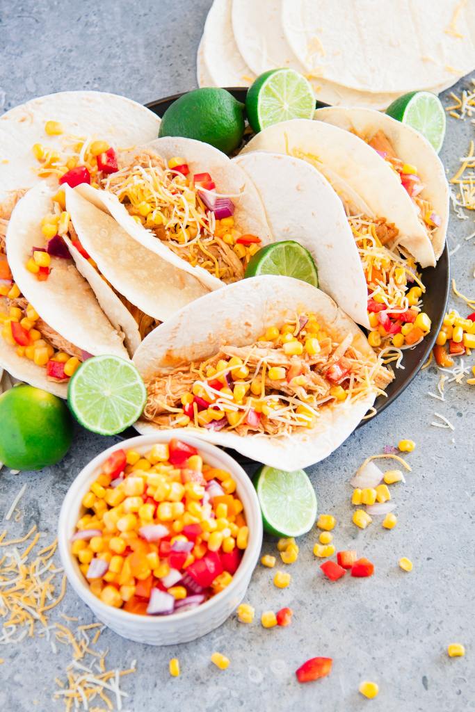 Place a tortilla of choice on a large plate, and top with a scoop of shredded chicken, a sprinkle of cheese, and a generous helping of corn salsa. Serve with a lime wedge and any of your other favorite taco toppings.