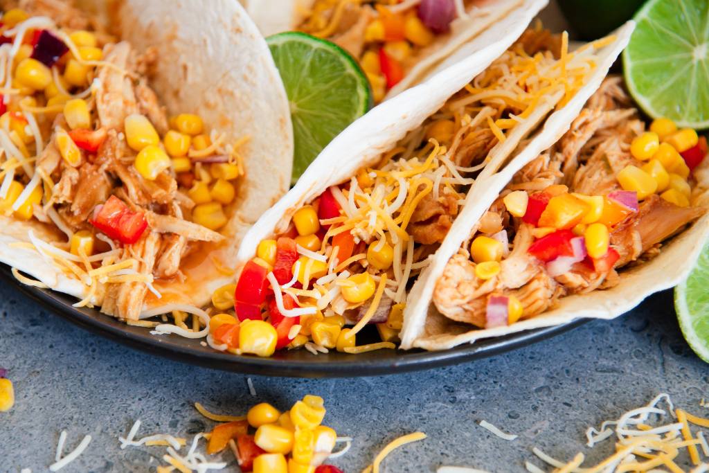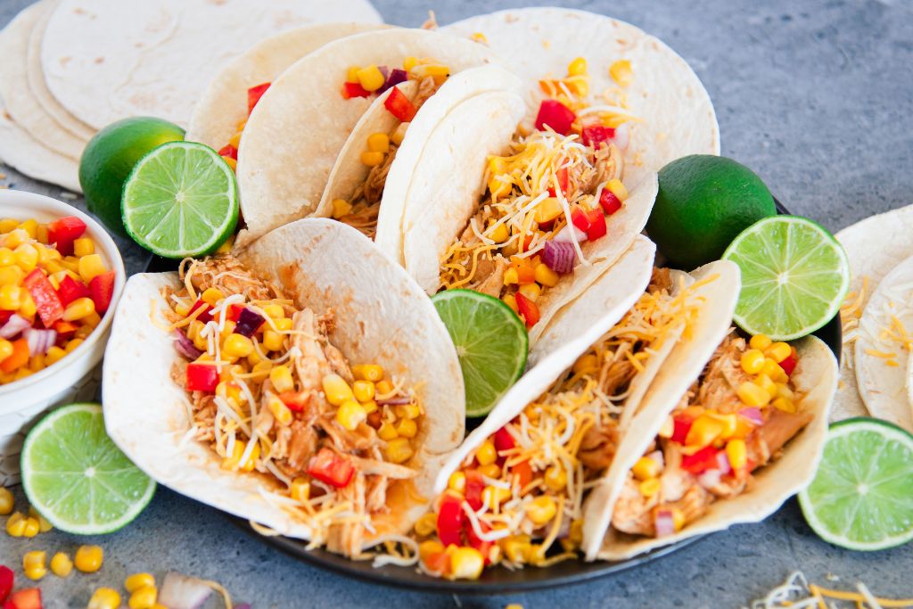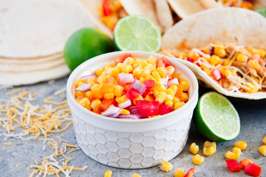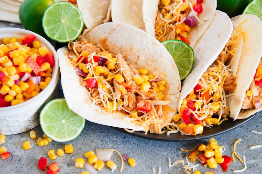 • Place a tortilla of choice on a large plate, and top with a scoop of shredded chicken, a sprinkle of cheese, and a generous helping of corn salsa. Serve with a lime wedge and any of your other favorite taco toppings.