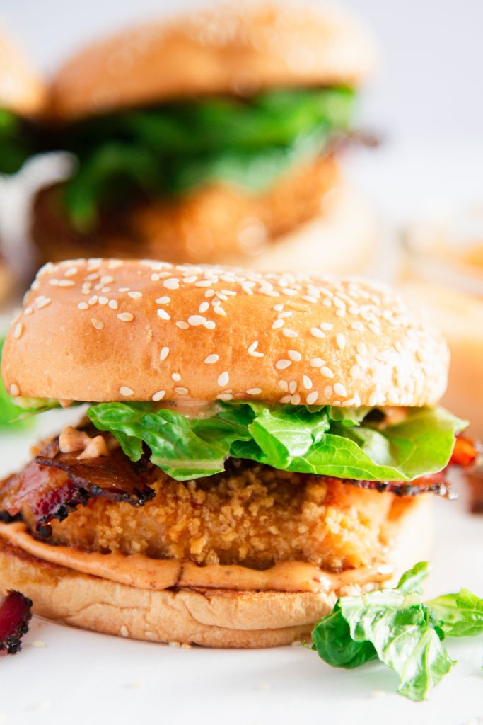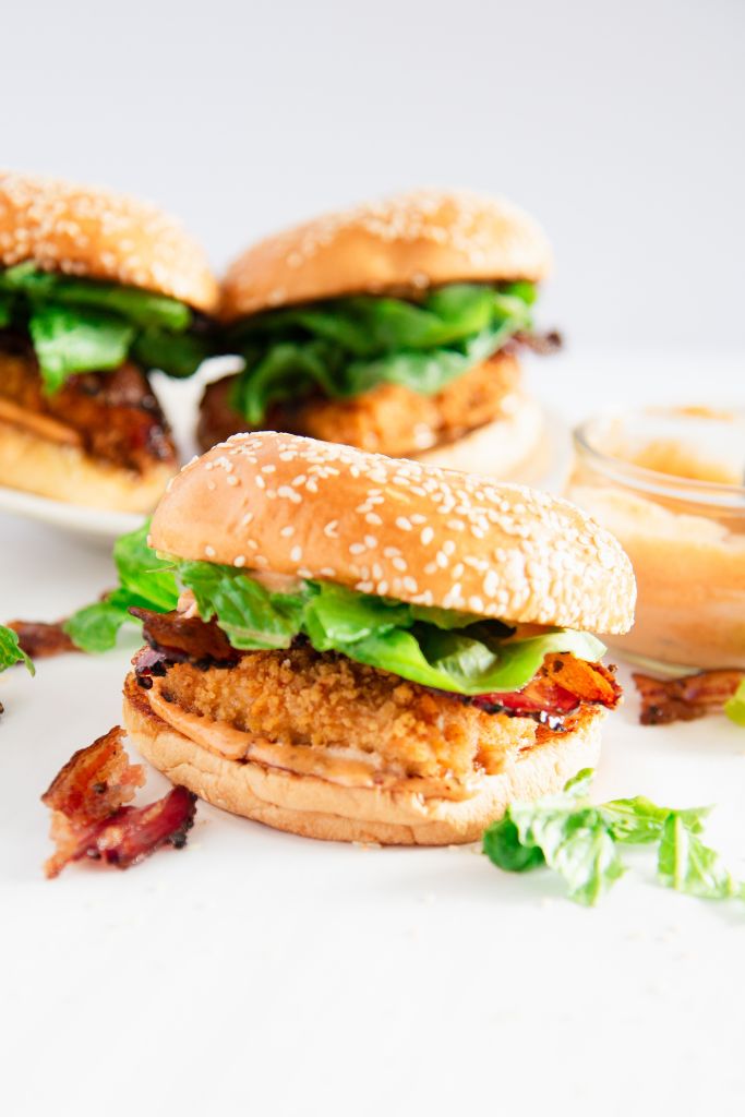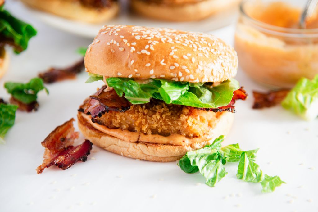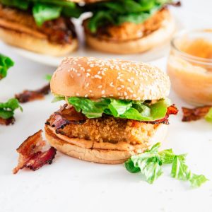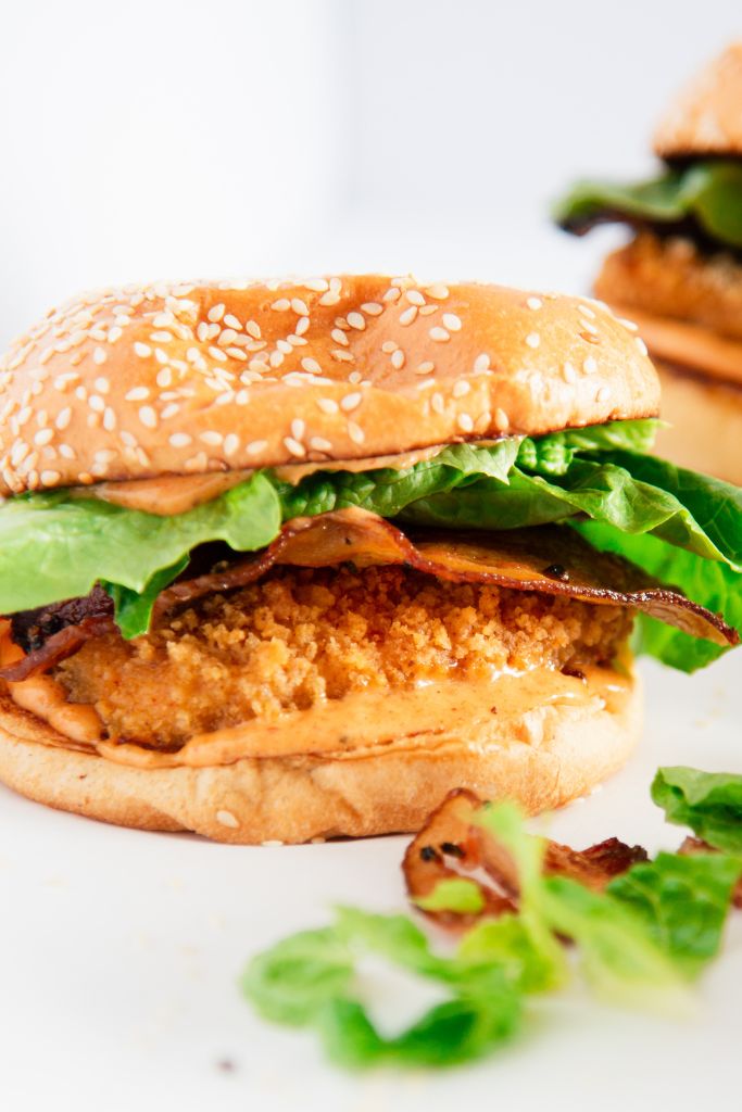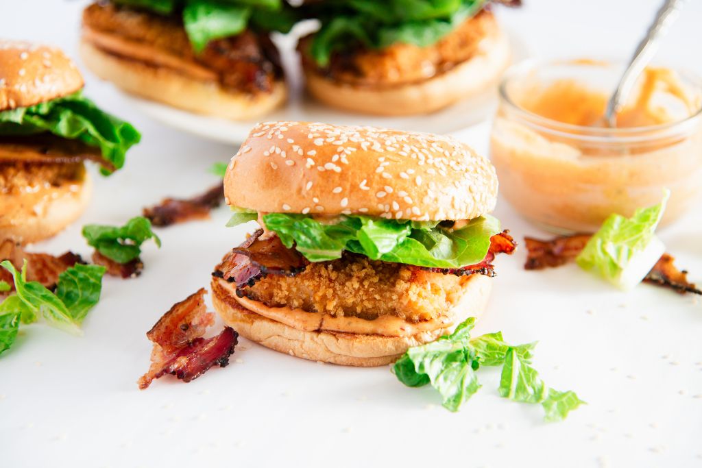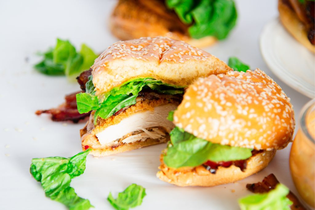This spicy Cajun chicken sandwich recipe is sure to be a hit with the whole family! Juicy fried chicken, topped with fresh lettuce, crispy bacon, and spicy Cajun aioli, this delicious recipe is perfect for busy weeknights, dinner parties, get-togethers, and more!