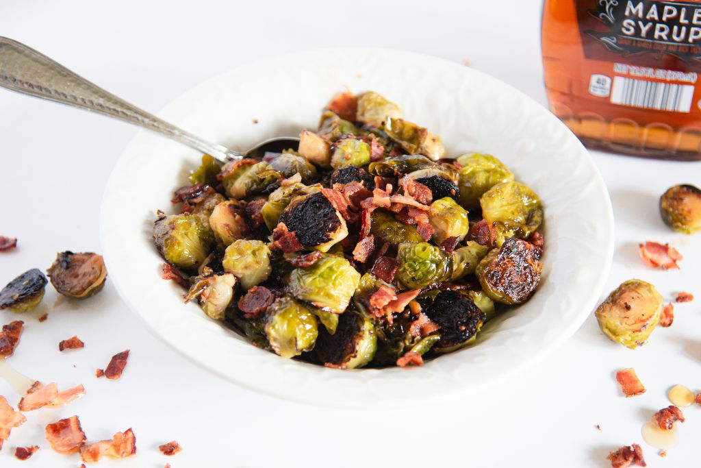 Any leftover maple bacon Brussels sprouts can be stored in an airtight container in the fridge for up to 5 days. They can easily be reheated on the stove or on a rimmed baking sheet in the oven. Just keep in mind they won’t be quite as crispy the next day.