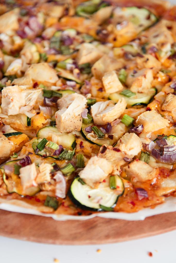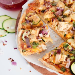 This homemade Thai pizza recipe is perfect for pizza nights, movie nights, game days, and more! A crispy homemade pizza crust topped with sweet chili sauce, diced chicken, and melty cheese creates the perfect combination of sweet and spicy and is sure to be a hit!