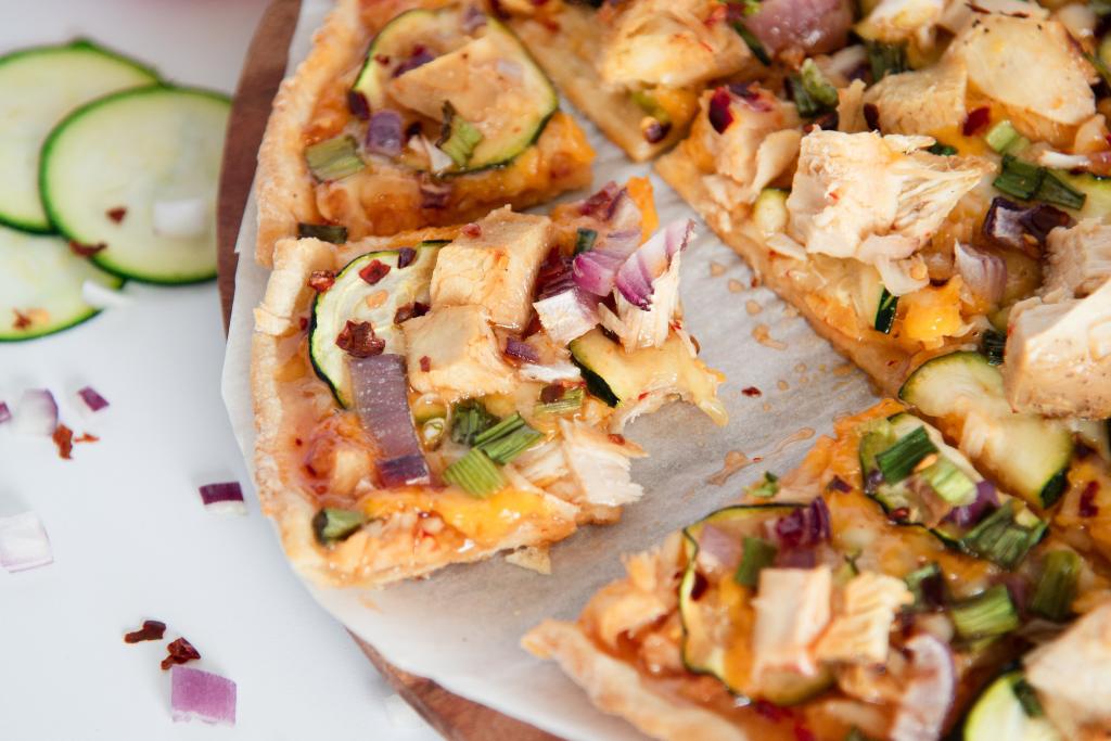 - Sprinkle your mixed cheese over the top of the chili sauce, doing your best to keep it evenly spread out. Layer the sliced zucchini over the cheese, followed by the diced chicken and red onion.